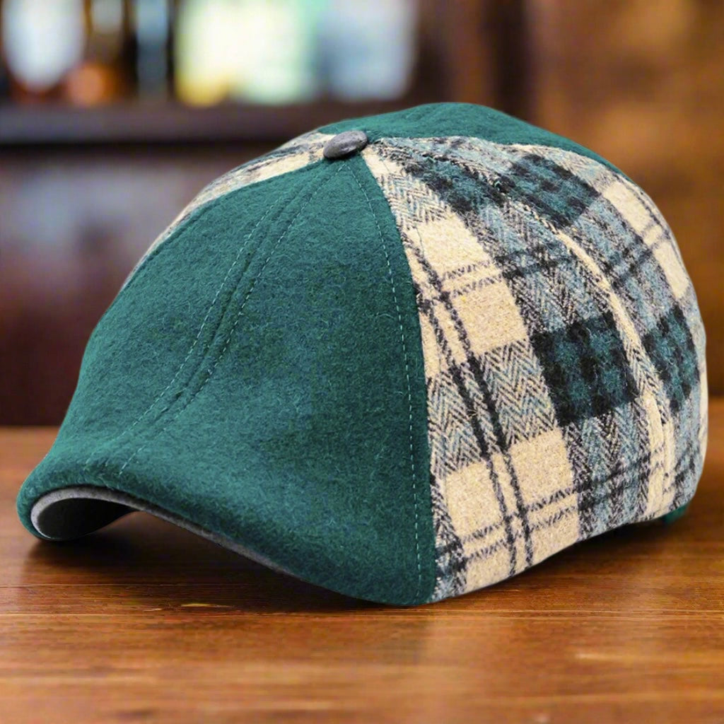 Introducing the ‘Craic’ scally cap, a tribute to good times, great company, and lively conversation. This 8-panel cap features a sophisticated mix of solid green panels and a green and beige plaid pattern. The black leatherette brim and button add a touch of style, while the green interior fabric and beige sweatband ensure comfort.