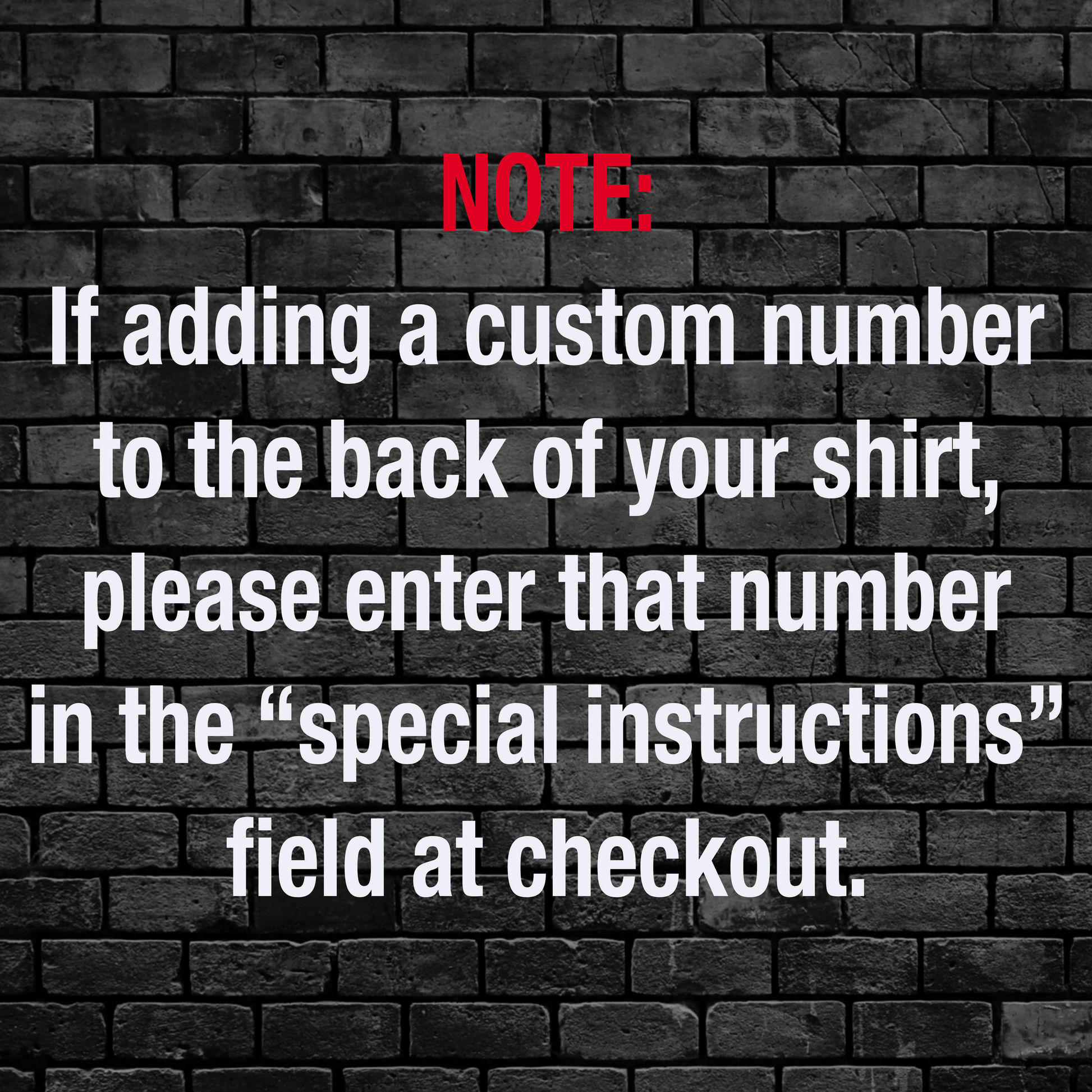 NOTE: If adding a custom number to the back of your shirt, please enter that number in the “special instructions” field at checkout